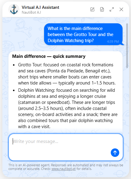 O NautiBot informa sempre os visitantes que as respostas são baseadas nos conteúdos do website e que qualquer reserva está sujeita a confirmação humana. Nunca confirma reservas automaticamente, assim nunca aceitará reservas que não pode cumprir.